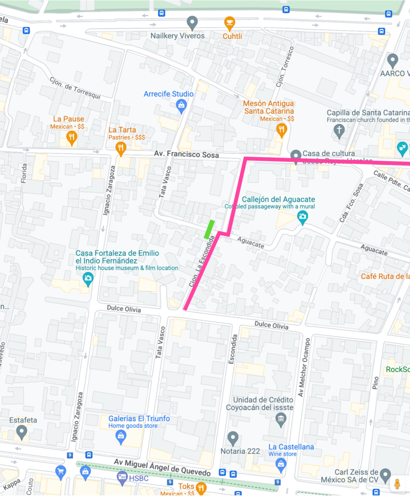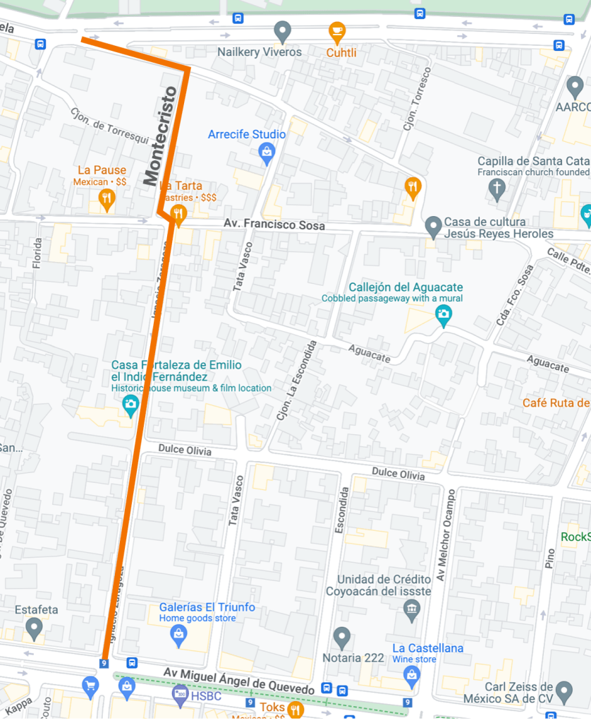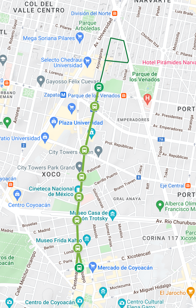 Esto que planteo se logra por ejemplo hacia el norte por la línea 5 del metro y sus conexiones. En zonas centrales, sin duda el servicio instrumentado es de mucha ayuda, y la línea 9 del metro. Pero no veo clara la estrategia hacia el extremo poniente o hacia el sur. En extremo poniente planteé en mi cuenta de tuiter la operación de la línea 2 de Metrobús al Auditorio Nacional, son 2 kilómetros desde la estación Parque Lira. No detallaré la propuesta porque no pasa por Coyoacán.