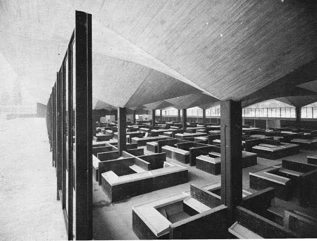 El mercado se veía así antes de su inauguración (con base en fotos encontradas en Google). Observen la imagen del lado izquierdo. Allí se nota que hay unas puertas, las cuales eran la entrada al mercado. Esto significa que la crujía exterior actual fue añadida en años posteriores.
