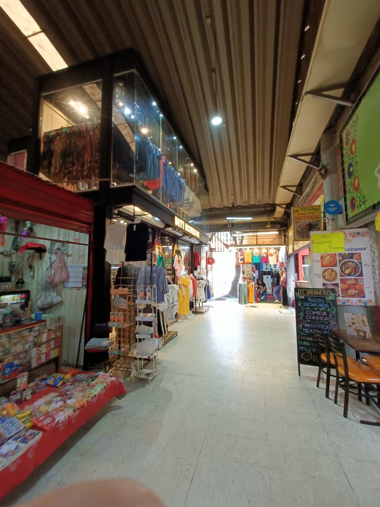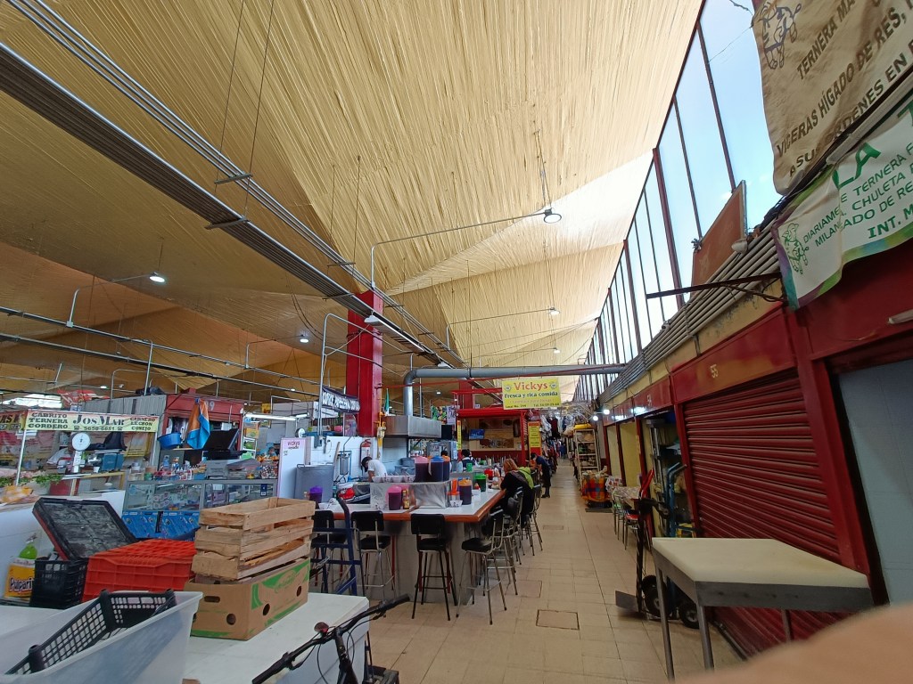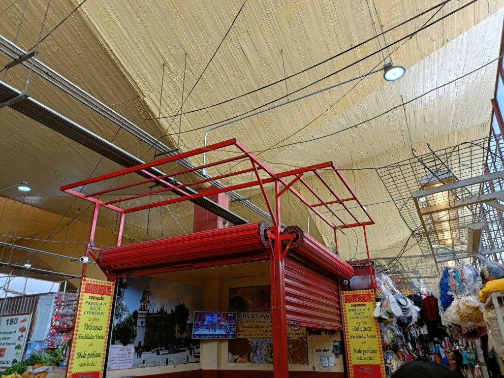 En la primera imagen pueden ver la estructura del mercado (espero poder hacer una buena descripción, no siendo arquitecto o ingeniero), los techos están directamente sostenidos de cada columna, no hay vigas, como no las suele haber en la obra de Félix Candela, uno de los arquitectos que diseñó este mercado. Sin embargo, los elementos estéticos quedan ocultos en la dinámica real del mercado: la ductería está elevada, cada local ha hecho lo que ha necesitado hacer para la funcionalidad de su local, como en este caso.