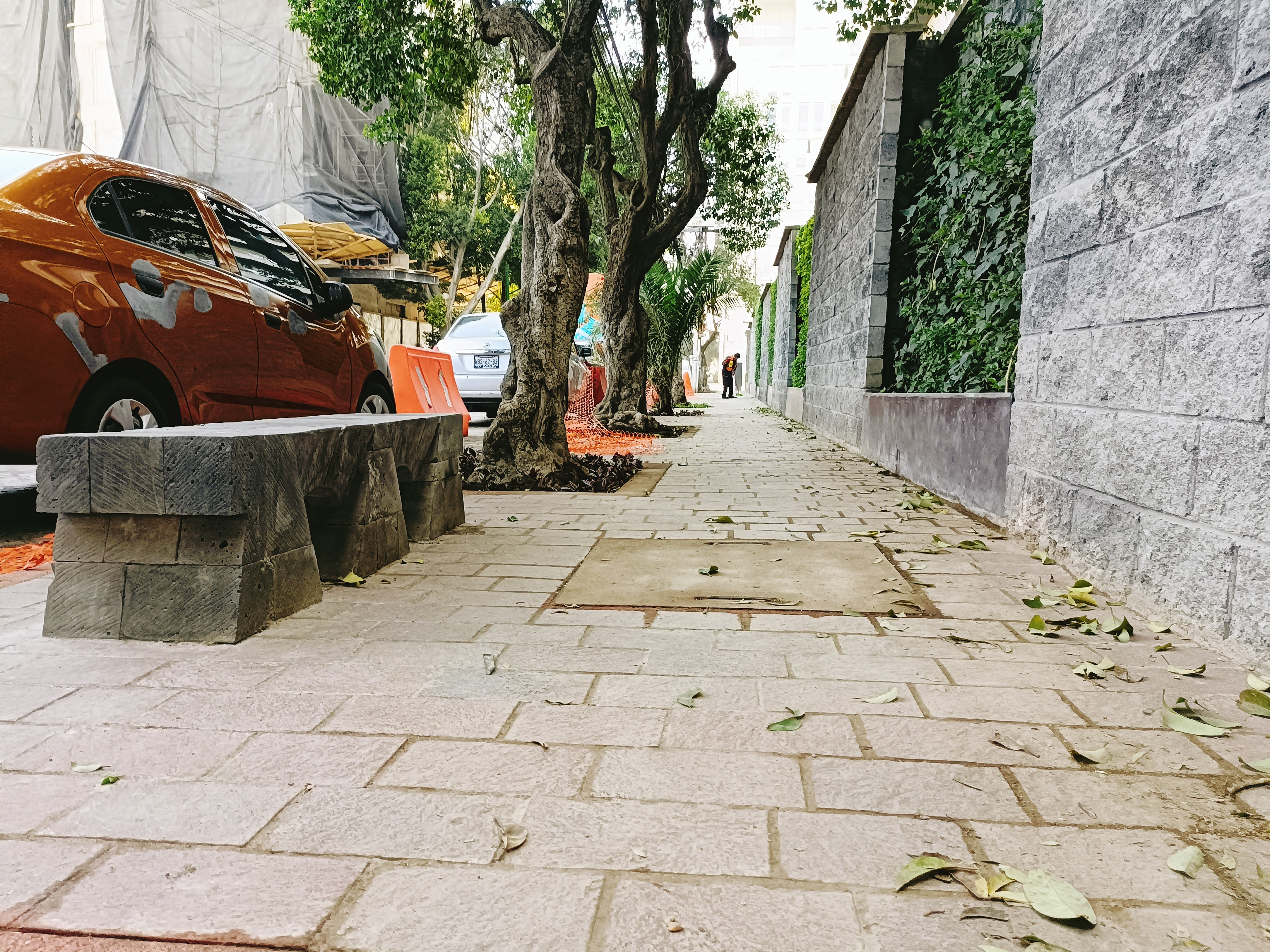 Lo pueden ver en esta imagen, donde pueden ver todo al mismo nivel pero con las piezas colocadas en distinto patrón marcando los límites entre áreas peatonales y áreas de circulación, pero al mismo dejando en claro que todo es peatonal o que el auto debe bajar la velocidad. También hay un patrón de áreas verdes, como se aprecia en los laureles que están a la izquierda de la imagen.
