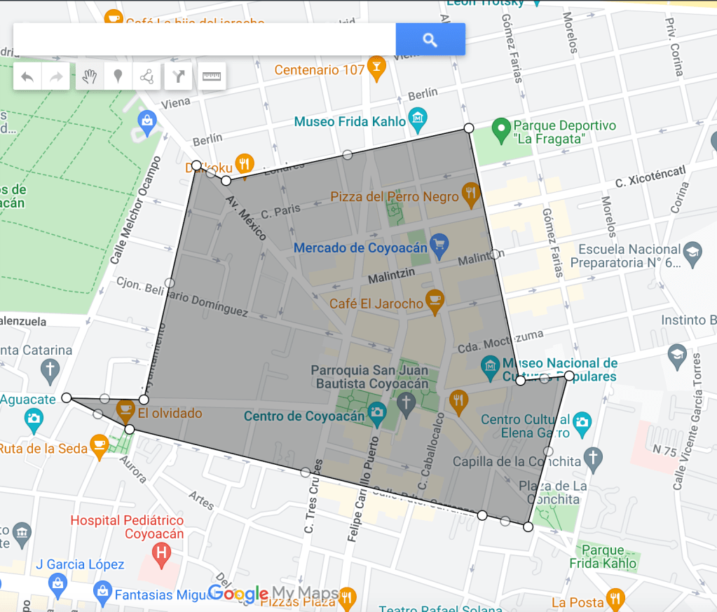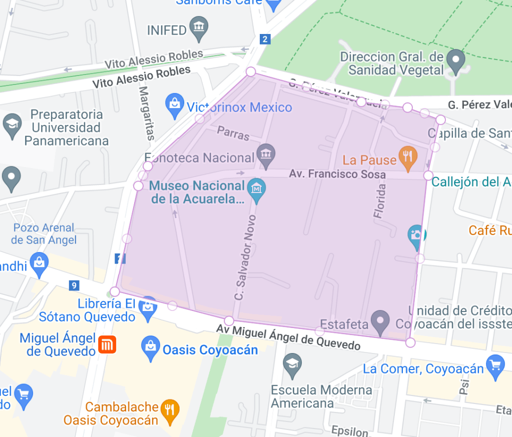 Otras zonas complejas son entornos de espacios específicos: Oasis, Hospital de la Ceguera, Prepa 6, Londres y Corina, entre otros. En el caso concreto de la cercanía a Oasis tenemos la solución: hay que comenzar la instrumentación en un polígono lejano al centro de Coyoacán. Diría que algo así: