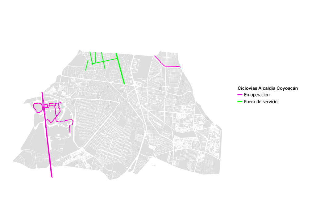 En Coyoacán sólo están las ciclovías interiores de la Ciudad Universitaria, y el tramo que le corresponde de Insurgentes, que en realidad es un ciclocarril compartido y peligroso, porque la velocidad máxima es superior a la de otras avenidas, 60 km/h.